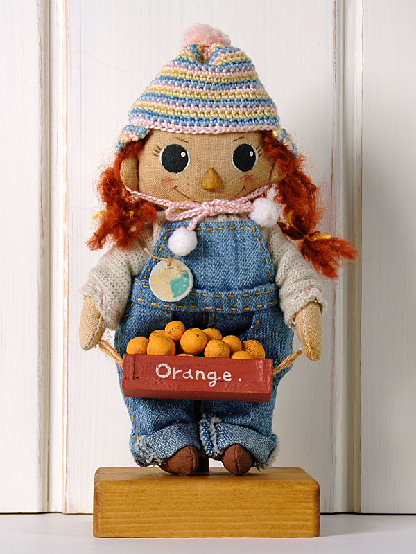 オレンジとオレンジの箱を、ドールより最初に作っていて、それを小物として持たせようと思い、このドールを作りました。